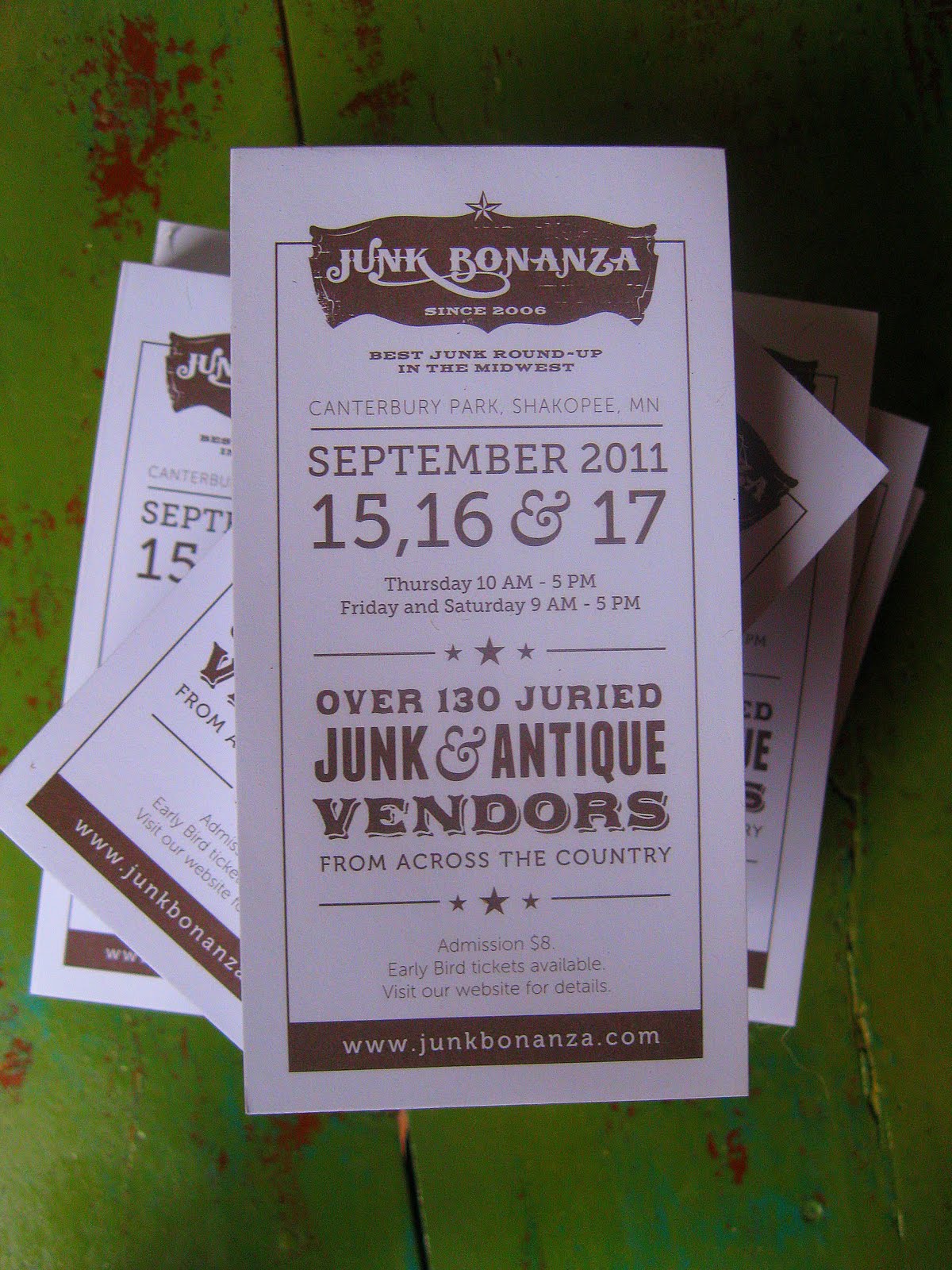 You will be receiving a pad of peel-offs soon, to share with friends, neighbors and all junker-centric types who will want to attend the Bonanza this fall (or will, once they know about it!)