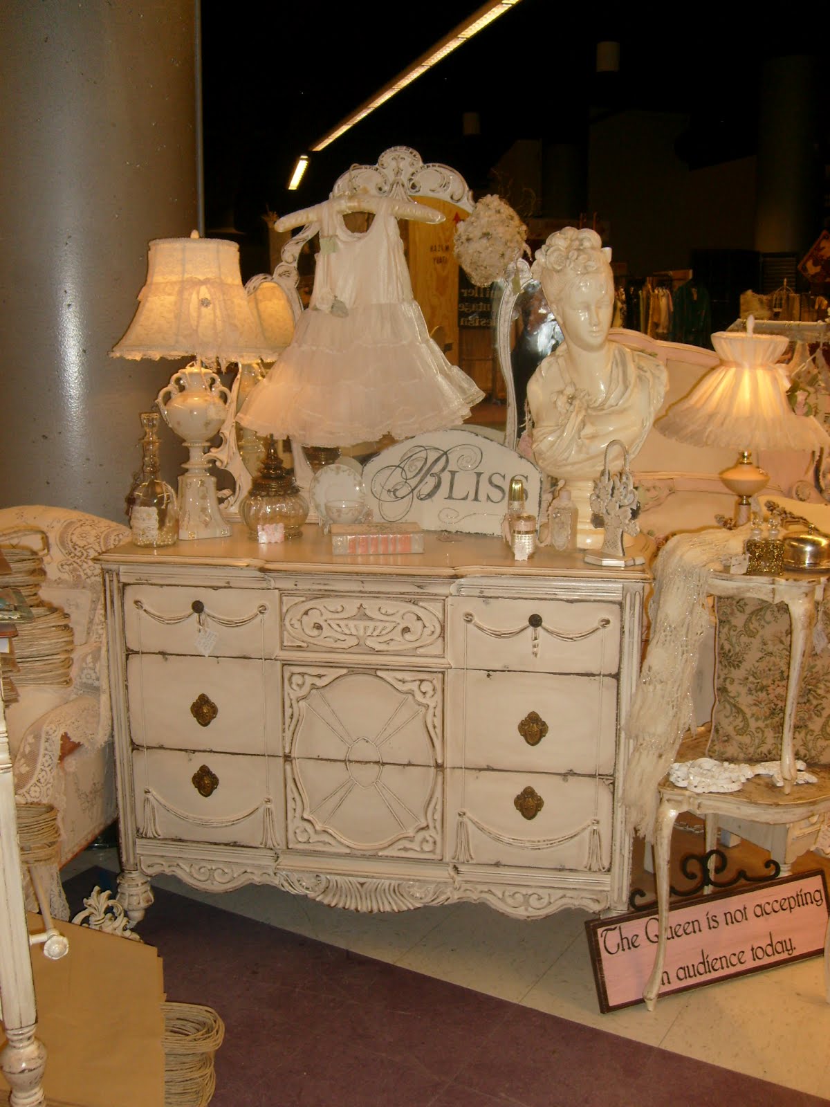 romantic, posh one-of-a-kind furnishings and decor, glam lighting and restyled chandeliers, custom signage antiqued to perfection, lacy French textiles, tattered and elegant clothing, romantic jewelry and crowns fit for a queen