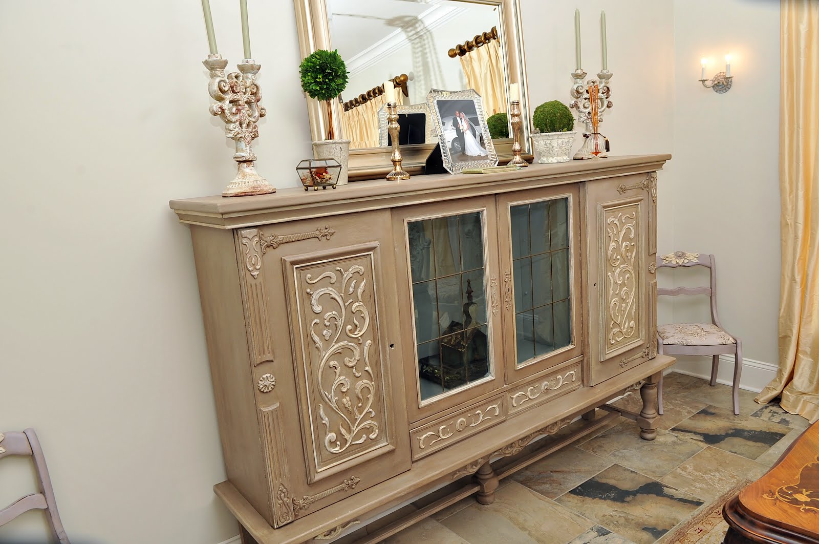 A sideboard from Greg’s Antiques, painted by Virginia Weathersby of the Southern Institute of Faux Finishing in AS Paloma and Coco.